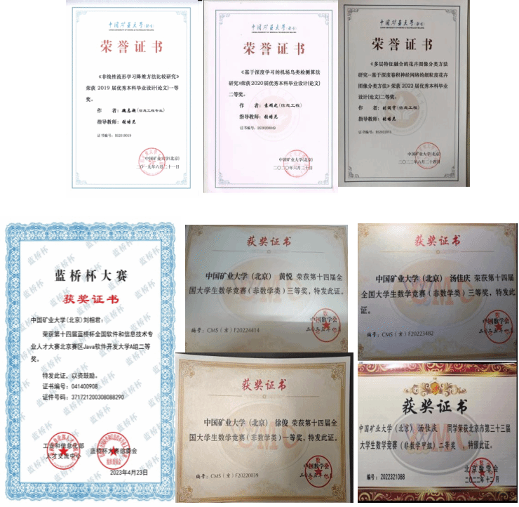 在张老师的悉心指导下,学生们的创新意识和实践能力有了明显的提升。在学科竞赛与学术深造方面,张老师指导的本科生展现出强劲的综合实力,获得多项国家级、省部级和校级荣誉,主要包括:国家励志奖学金(1人),校级特级奖学金(2人);大学生数学竞赛全国一等奖(1人)、三等奖(2人);蓝桥杯java省级二等奖(1人)、三等奖(1人);第五届移动通信技术大赛2等奖(1人);大唐杯北京市3等奖(4人);大学生英语竞赛二等奖(3人);校级优秀毕业设计(3人)等。此外,多名本科生以专业第一等优异成绩,出国或保送至985高校、科研院所继续深造。这些荣誉不仅体现了学生扎实的专业功底与突出的实践能力,更彰显了张老师"以竞赛检验学习成效、以实践反哺能力提升"的培养理念。