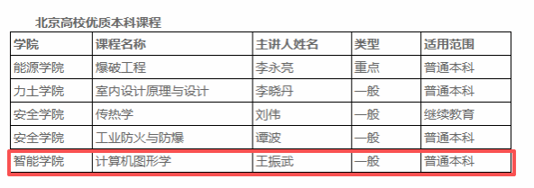 本次评选中,王振武教授主讲的 《计算机图形学》 课程获评北京高校优质本科课程(一般项目,适用全日制本科)。该课程是计算机科学与技术专业核心必修课,历经多年建设与持续改革,形成线上线下混合式教学、自制 OpenGL 实验平台、三阶段图形学实验教学、多元化考核的鲜明特色。课程以图形系统能力培养为核心,将算法理论、编程实践与矿山三维可视化、城市信息模型等行业场景深度融合,配套自编教材获评北京高校优质本科教材,教案获评北京高校优质本科教案,教学成果获北京高校教师教学创新大赛优秀奖、全国煤炭行业教学成果奖等多项荣誉,教学质量与育人成效广受师生与专家好评。