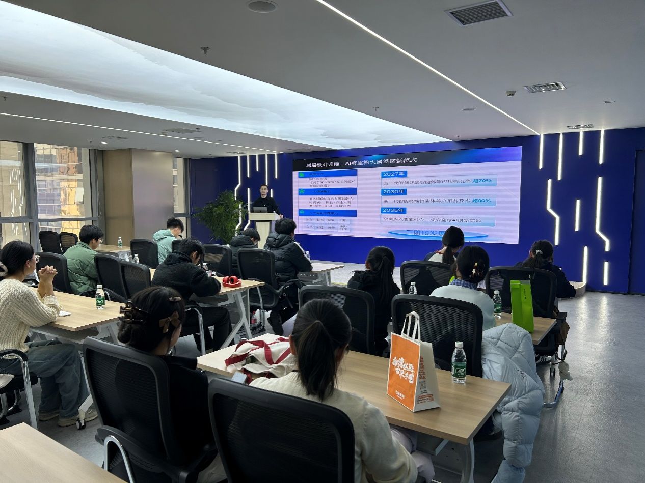 参观过程中,师生走进会议室,与企业专家展开深入交流。专家以“人工智能‘十五五’发展全景蓝图:从要素突破到范式重构”为题,从技术要素突破、产业范式重构的双重视角,系统梳理人工智能的演进脉络、前沿技术趋势与未来行业格局。同时结合自身深耕领域的实践经验,细致解读规划背景下人工智能核心岗位的能力模型、人才需求导向及职业成长路径,为同学们锚定专业发展方向、制定契合产业趋势的职业规划提供了极具针对性与实操性的指导。